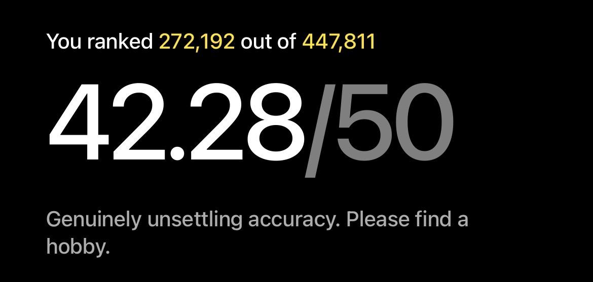 Got a 43.59 as my score, playing on my pixel 9 pro with colors set to "natural".